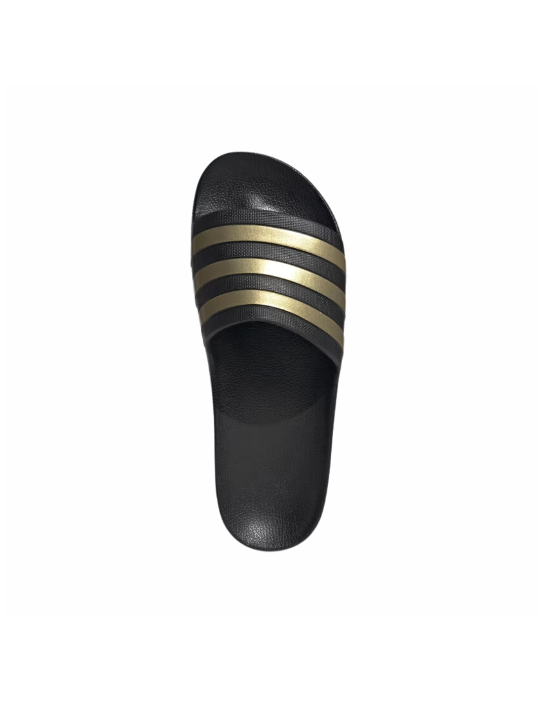 Este modelo de cholas destaca por su elegante combinación de colores negro y dorado, lo que les da un toque sofisticado y moderno. La banda superior presenta el icónico logo de Adidas en dorado, resaltando sobre el fondo negro para un contraste llamativo y estilizado.