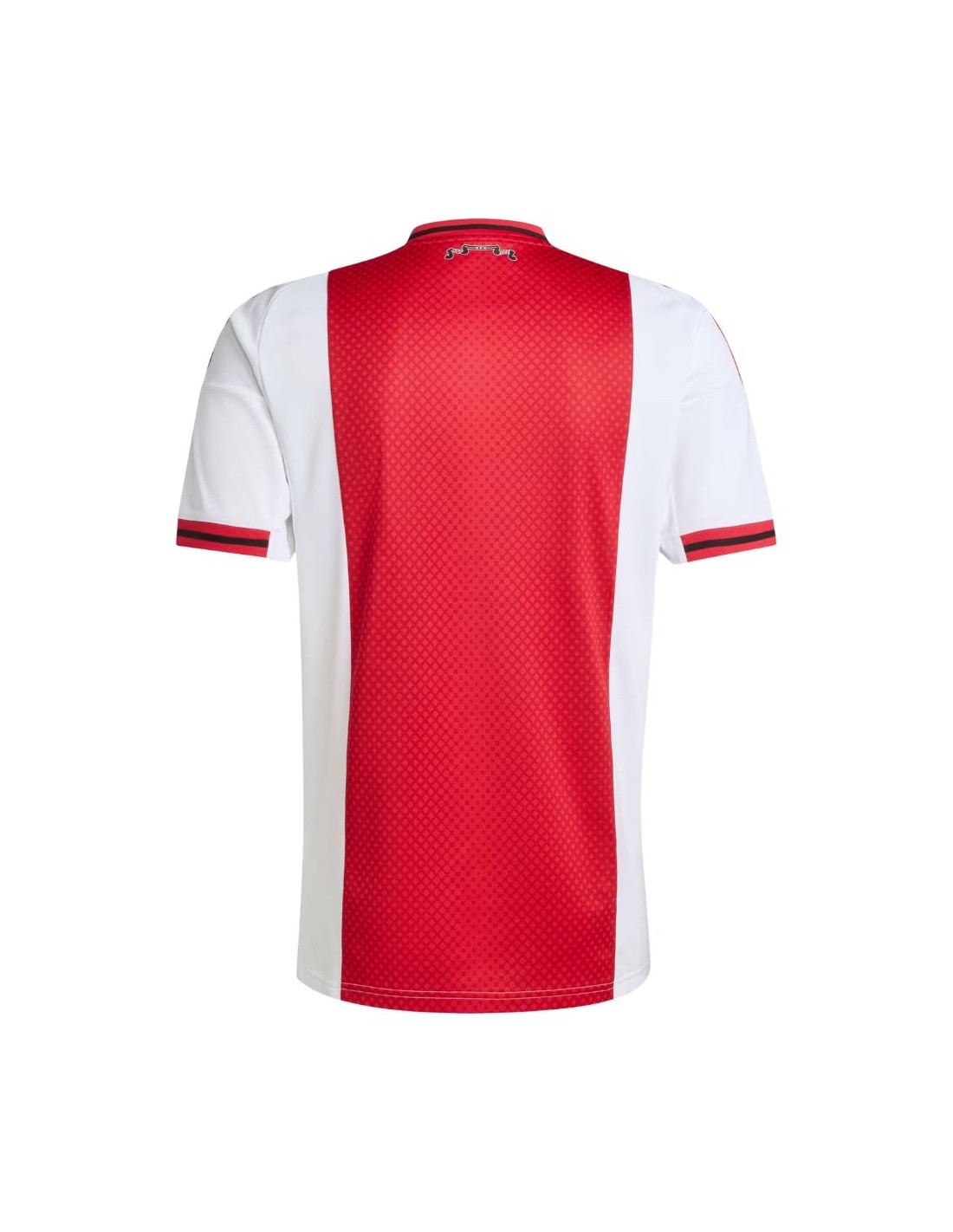 Presenta un ajuste regular y cuello en V. Su diseño combina el clásico blanco-rojo-blanco con la barra central decorada por las emblemáticas «X» de la bandera de Ámsterdam y un detalle conmemorativo en la nuca.