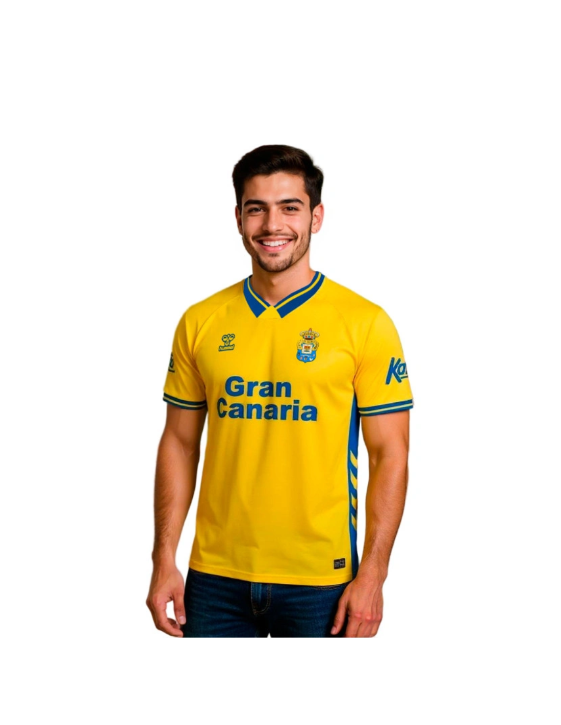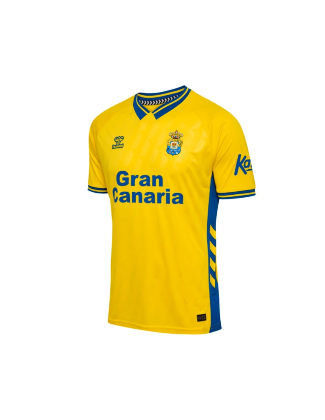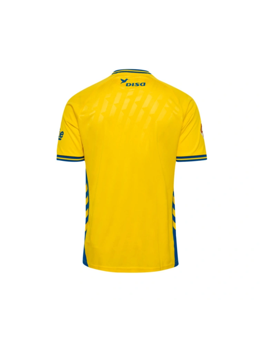 El diseño mantiene el icónico color amarillo de la UD Las Palmas, con detalles en azul que resaltan en cuello y mangas. Incluye el escudo oficial bordado en el pecho y el logo de Hummel en el lado opuesto, además de los característicos chevrones en los hombros. Corte ajustado para un look deportivo y elegante.