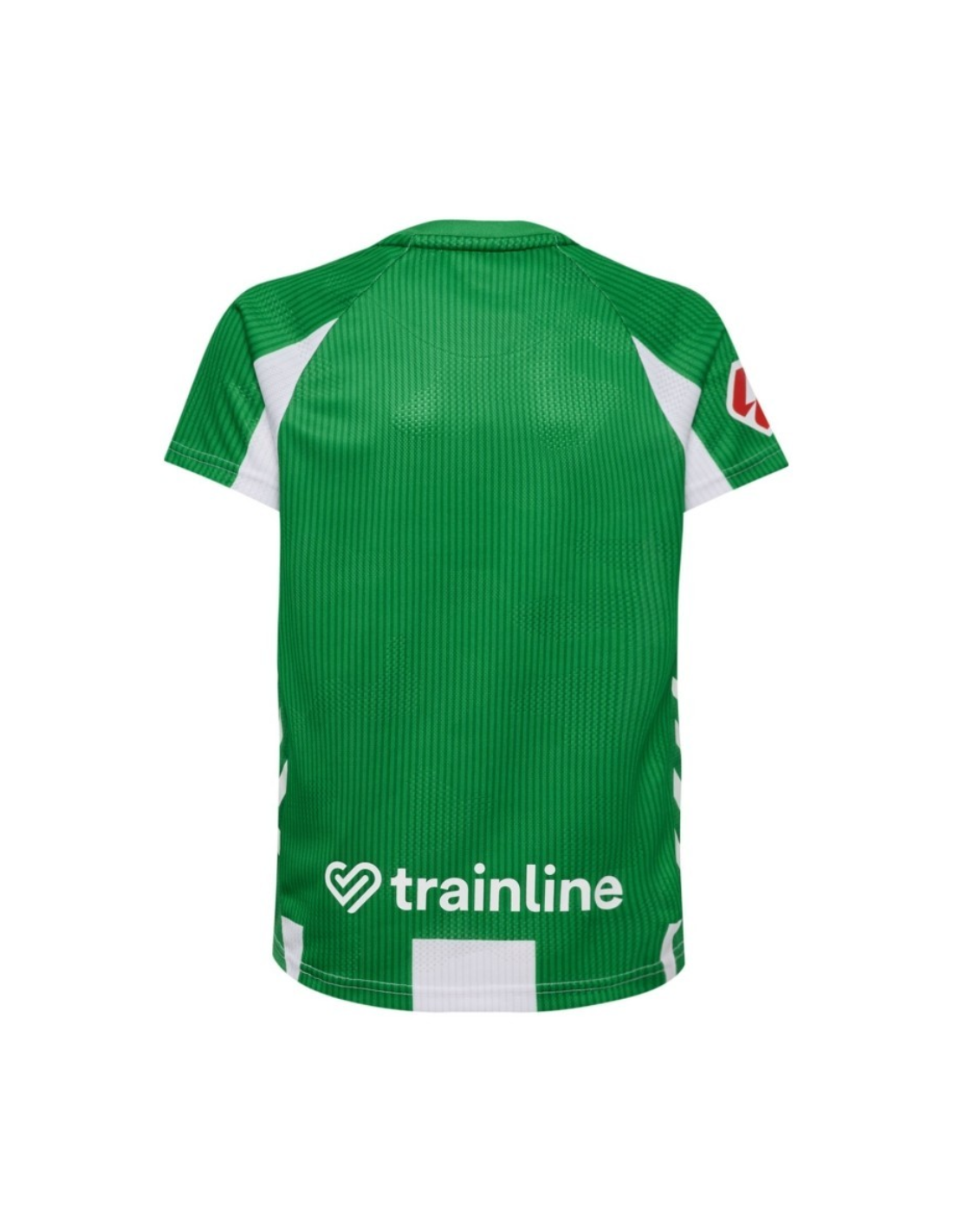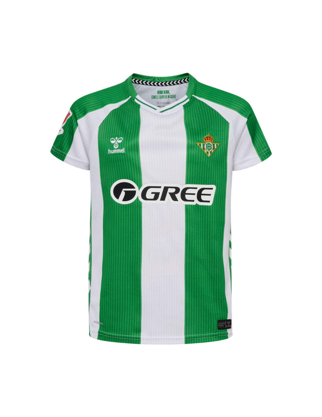 La camiseta luce rayas verticales verde y blanco de mayor grosor, con la espalda en verde sólido para facilitar la visibilidad del dorsal. El escudo del Real Betis y el logo Hummel están bordados con acabados premium. Los hombros incluyen las icónicas chevrons blancas de Hummel, aportando un toque clásico y moderno.