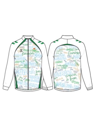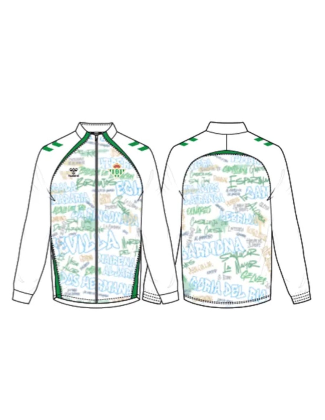 Su diseño moderno en color verde bético con detalles en blanco y el icónico logo Hummel, junto con el escudo oficial del Real Betis Balompié, aporta un look profesional y elegante. Incluye cremallera completa, cuello alto y bolsillos laterales para mayor funcionalidad.