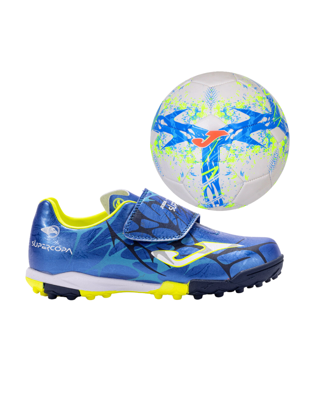 Las JOMA SUPERCOPA JR 2504 TURF son el calzado perfecto para los jóvenes apasionados por el fútbol. Con un diseño en azul royal y amarillo vibrante, estas zapatillas destacan tanto por su estética moderna como por su funcionalidad en césped artificial.