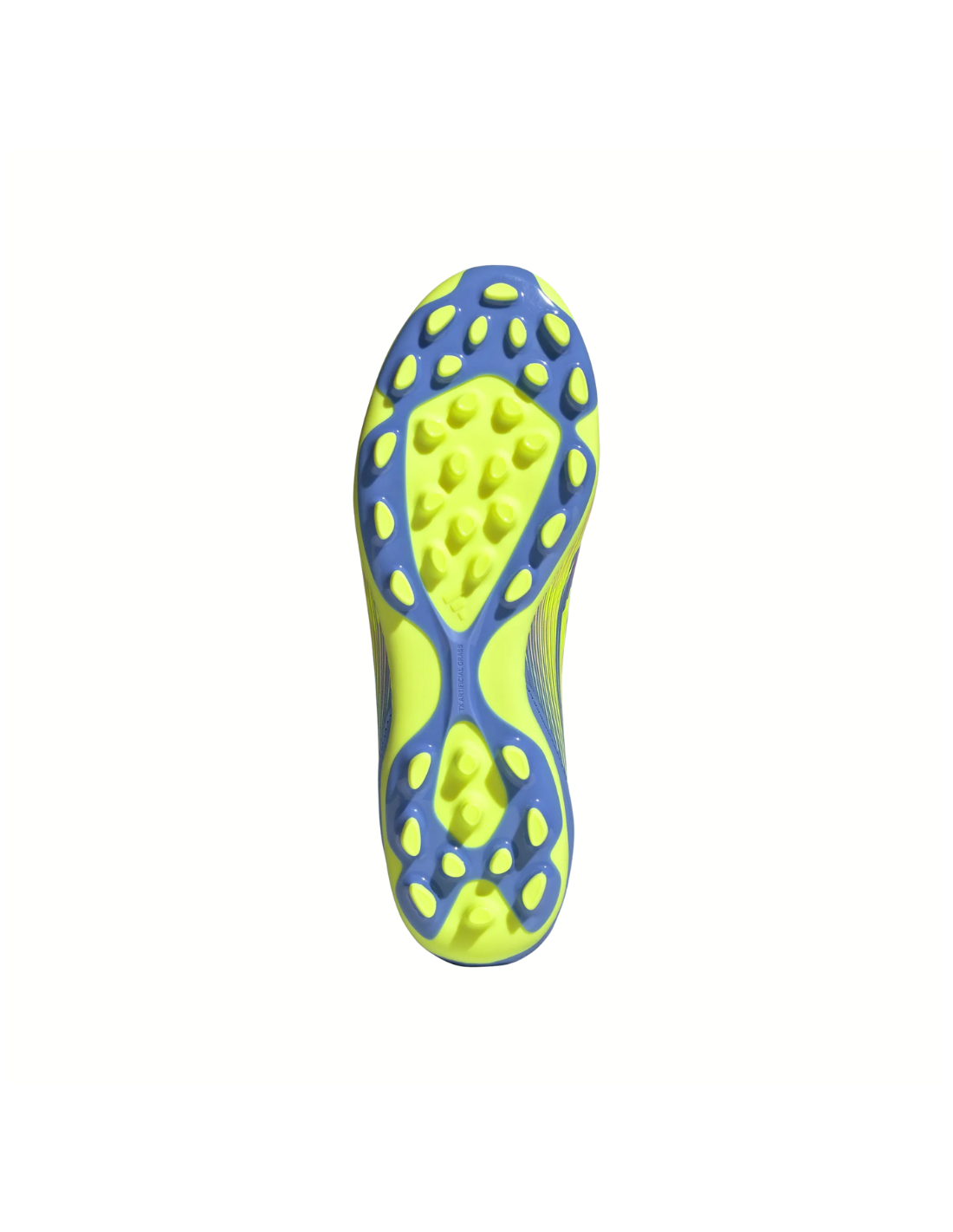 El impactante color azul con detalles en rosa combina estética y agresividad, mientras que la estructura aerodinámica de la bota favorece la aceleración. La lengüeta integrada y el ajuste tipo calcetín brindan un ajuste cómodo y seguro.