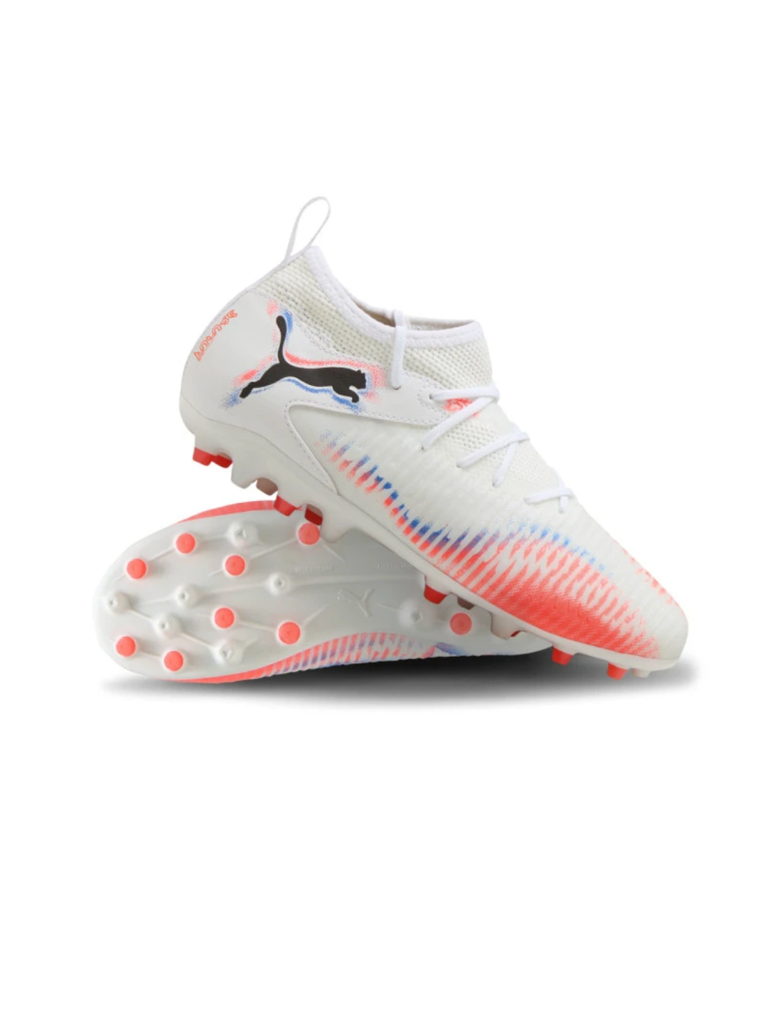 PUMA Future 8 Match MG Jr Blanco – botas de fútbol junior FG/AG. Upper mesh ligero, GripControl, multiterreno. Sujeción y agilidad para futbolistas jóvenes.