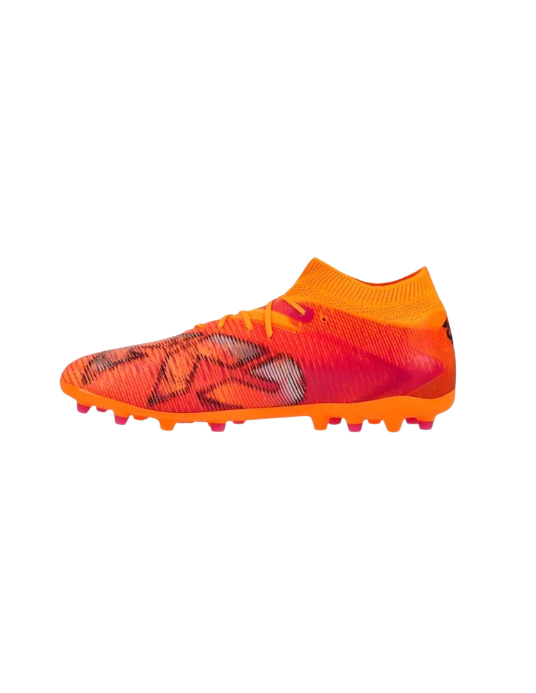 Presentan un cuello alto tipo "sock" que envuelve el tobillo para un ajuste tipo segunda piel. La suela MG (Multi-Ground) tiene tacos cortos y numerosos puntos de contacto pensados para césped artificial, turf y superficies mixtas. Diseño moderno y dinámico, disponible en combinaciones de color como White / Puma Black / Glowing Red.