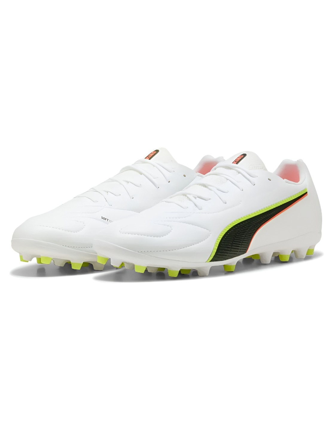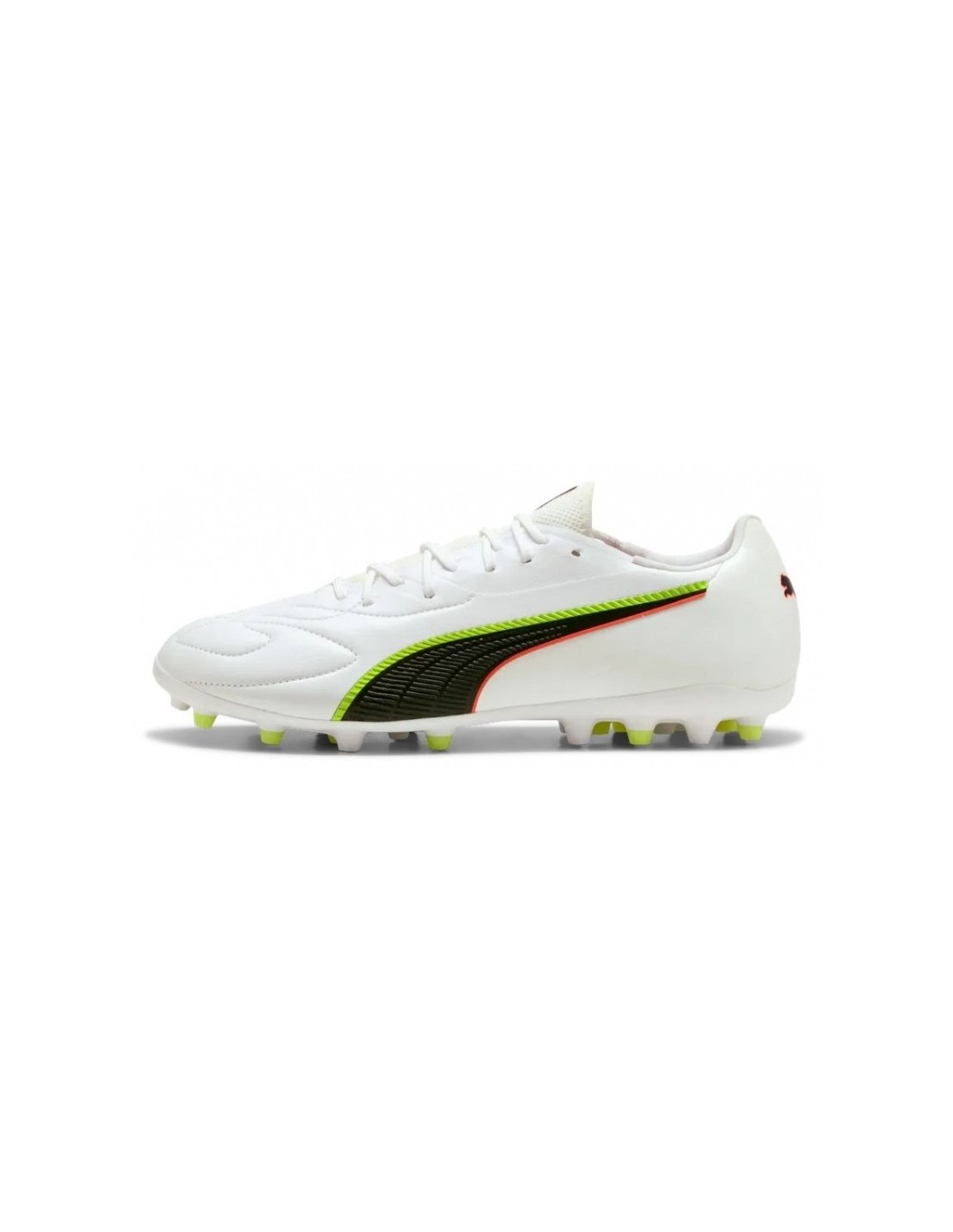 Este modelo presenta un diseño elegante y deportivo en tonos negros con detalles clásicos de la línea Puma King. Cuenta con una estructura ligera, lengüeta acolchada y plantilla ergonómica para un ajuste natural del pie. Los tacos MG están distribuidos estratégicamente para ofrecer agarre y estabilidad sin sobrecargar las articulaciones.