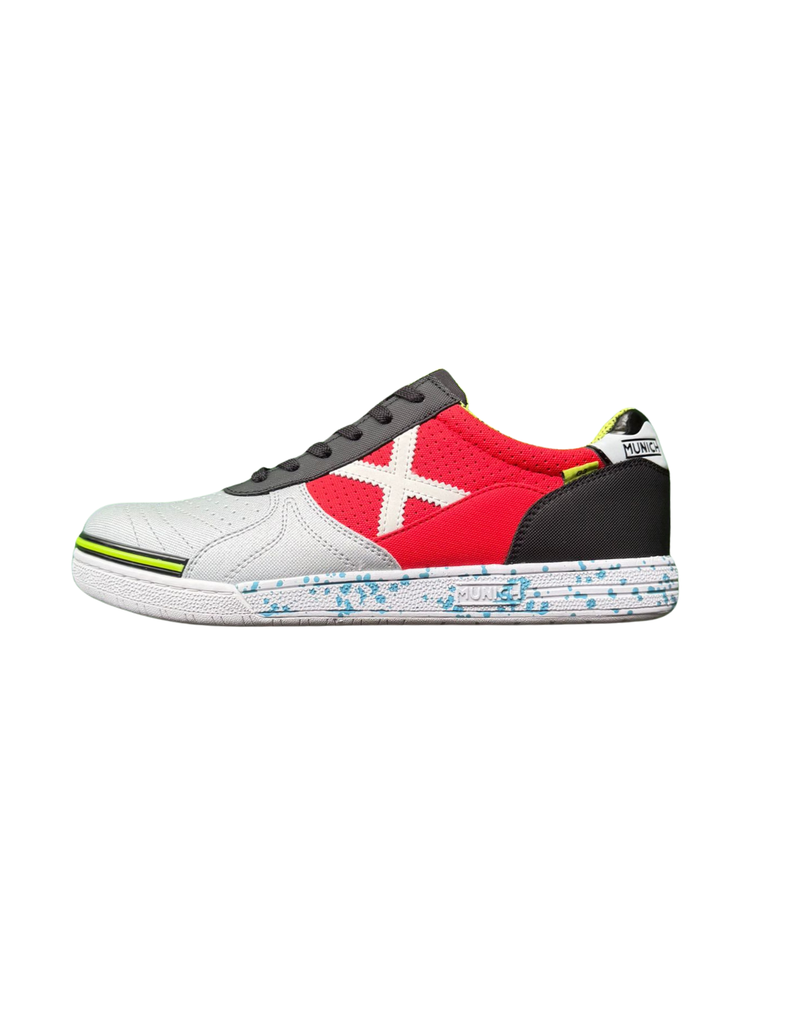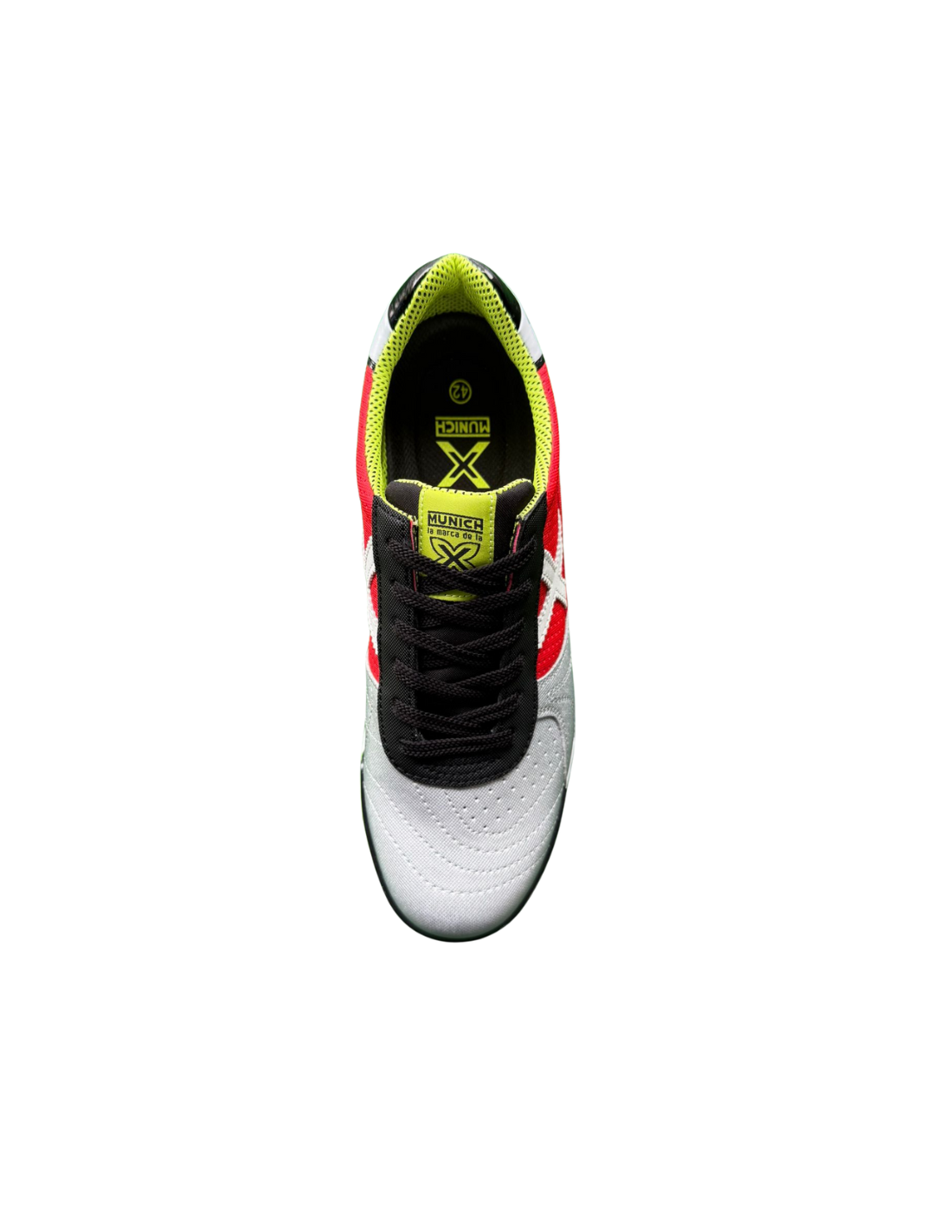 Este modelo destaca por su diseño multicolor llamativo y moderno, con el clásico logo "X" de Munich en contraste, que garantiza identidad y personalidad en la cancha. Su silueta estilizada se adapta perfectamente al pie, ofreciendo ligereza sin sacrificar estabilidad. El sistema de cierre con cordones asegura un ajuste cómodo y personalizado.