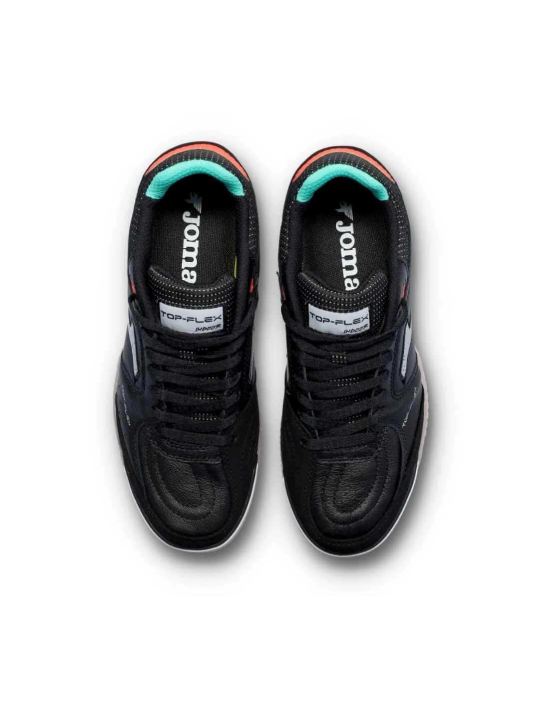 Zapatillas de fútbol sala JOMA TOP FLEX 2501 en color negro, diseñadas para máximo confort, durabilidad y control en el juego. Ideales para jugadores profesionales y amateurs que buscan flexibilidad, tracción y excelente amortiguación en pistas indoor.