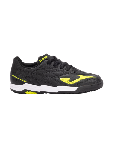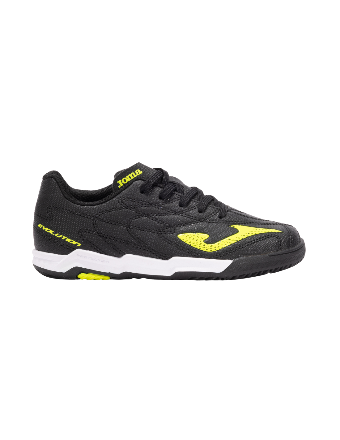 Zapatillas JOMA Evolution Indoor 2501 JR negras para fútbol sala junior. Ligeras, resistentes y con suela antideslizante para máximo agarre y control en pista interior.