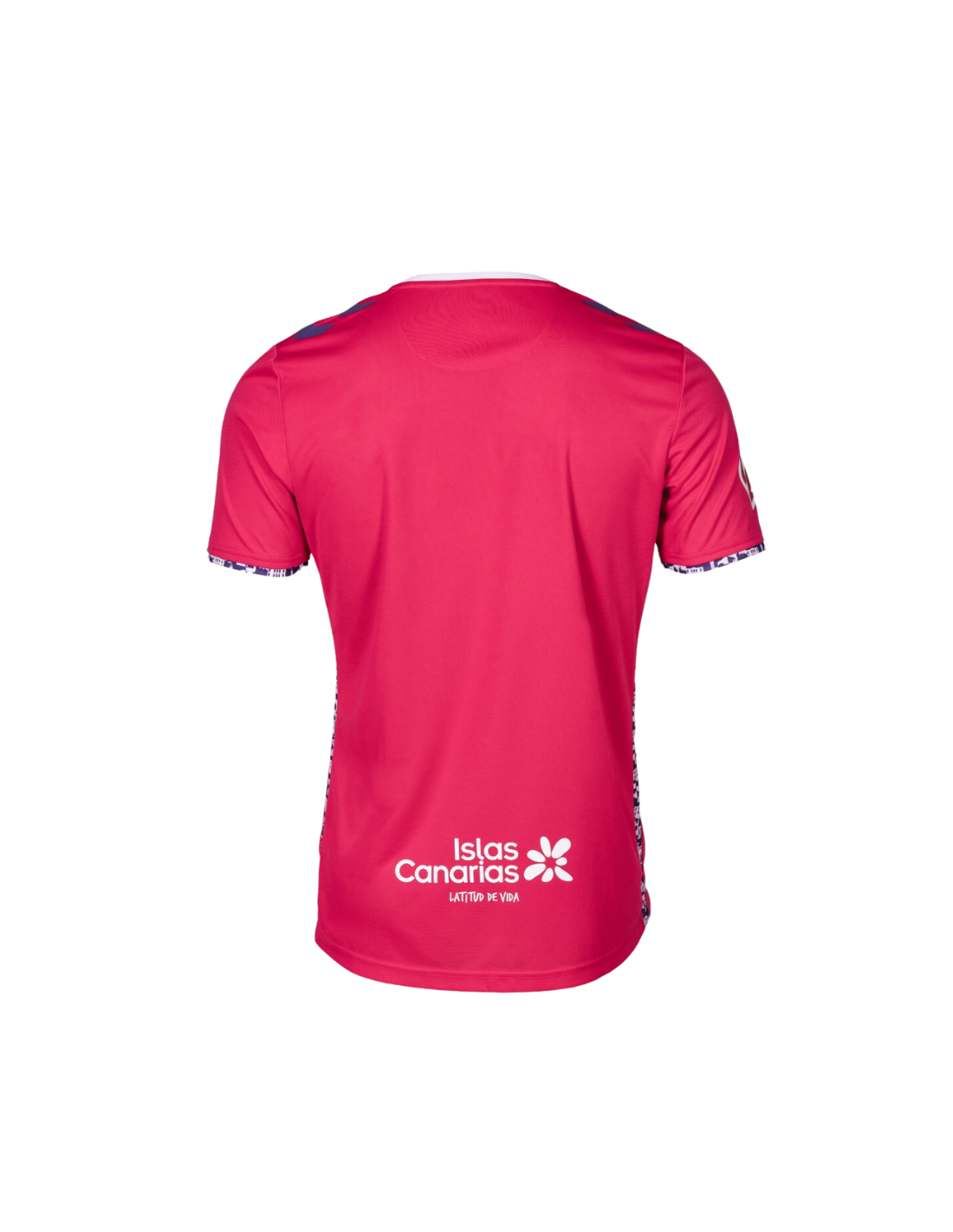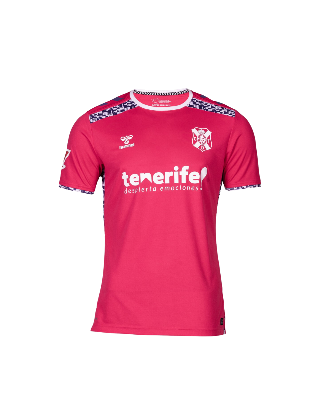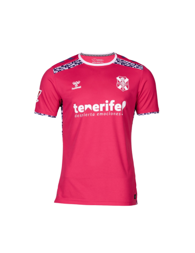 Esta camiseta se presenta en un llamativo color rosado, representando una opción fresca y moderna para los seguidores del CD Tenerife. El diseño incluye el logotipo de Hummel y el escudo del equipo, ambos situados en el pecho. Las tradicionales chevron stripes de Hummel adornan los hombros, añadiendo un toque distintivo y elegante.