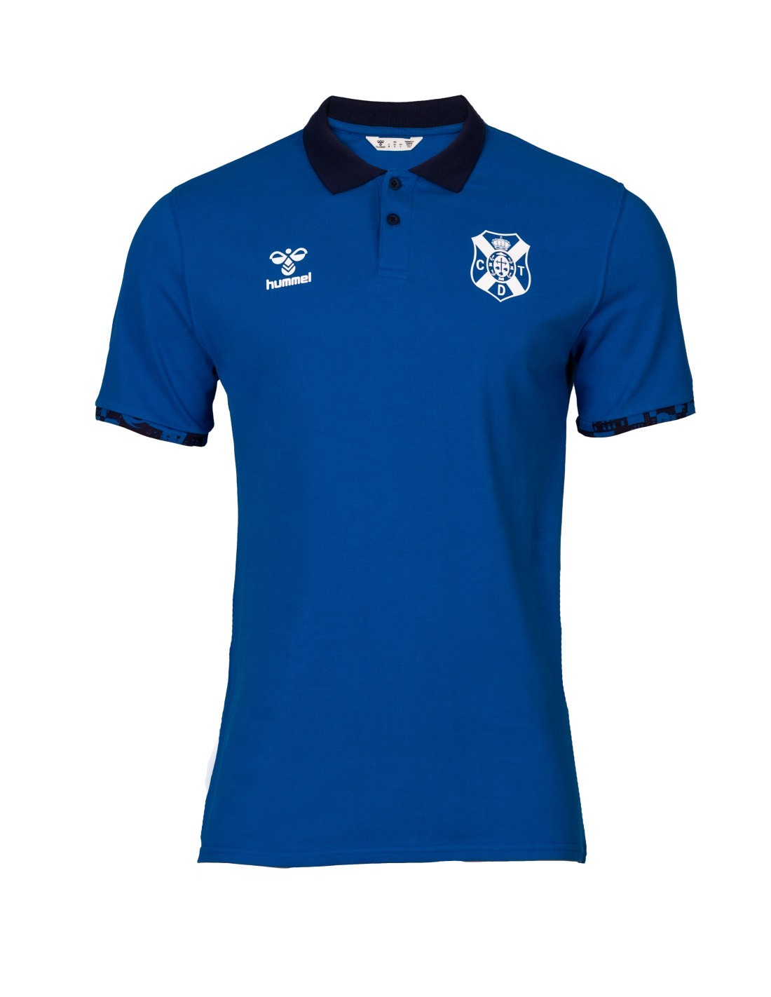 Presenta un diseño clásico y elegante en color azul, con el escudo del CD Tenerife y el logotipo de Hummel bordados en el pecho. Incluye detalles en blanco que resaltan en el cuello y las mangas, dando un toque de distinción y estilo.