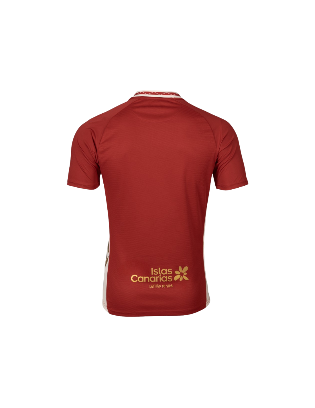 Presenta un tono rojo intenso y vibrante, con pequeños detalles en blanco y azul que rinden homenaje a la identidad del CD Tenerife. El corte junior se ajusta cómodamente sin restringir movimientos. Cuenta con cuello redondo y mangas cortas, además del escudo bordado del club y logo de Hummel en pecho y hombros.