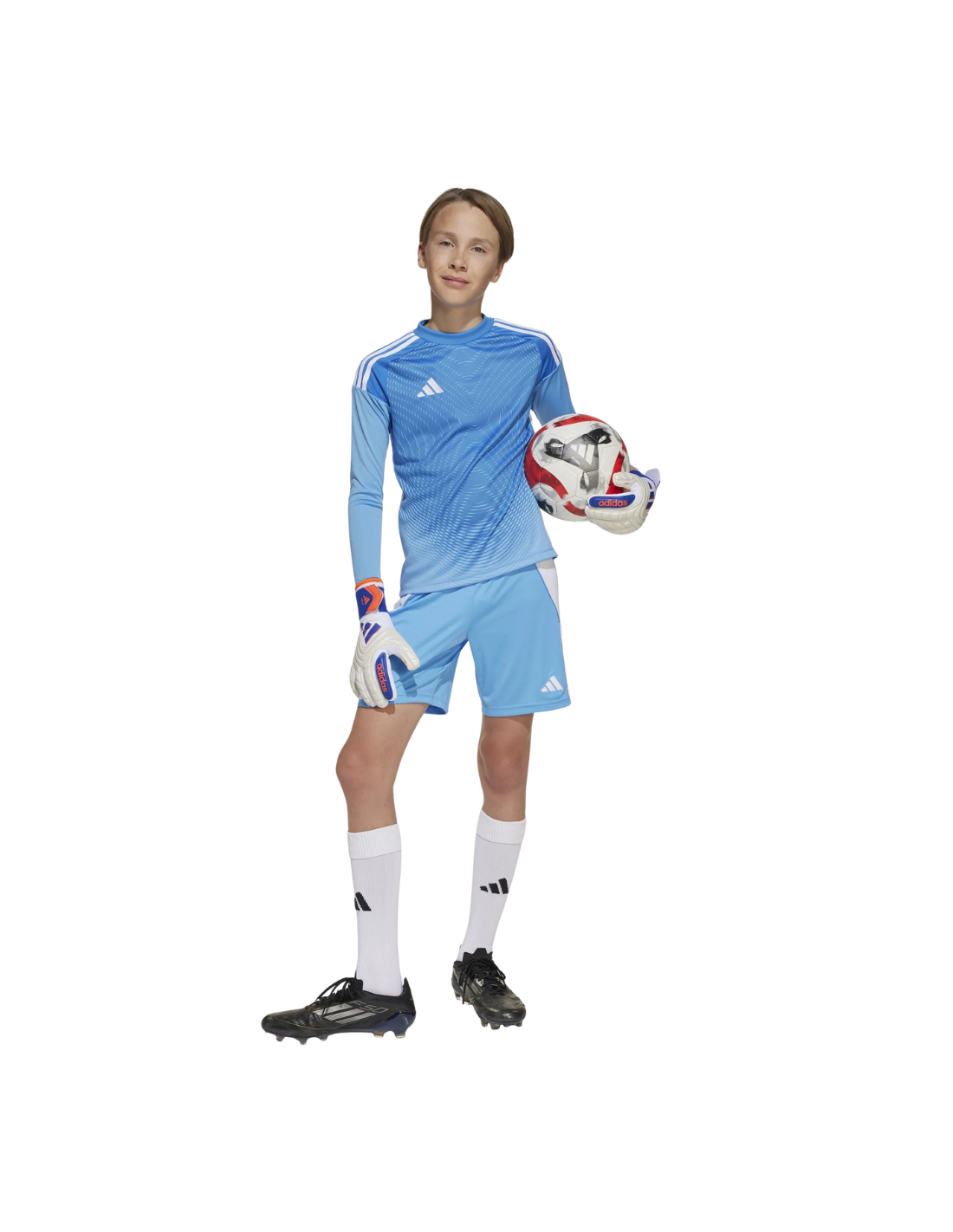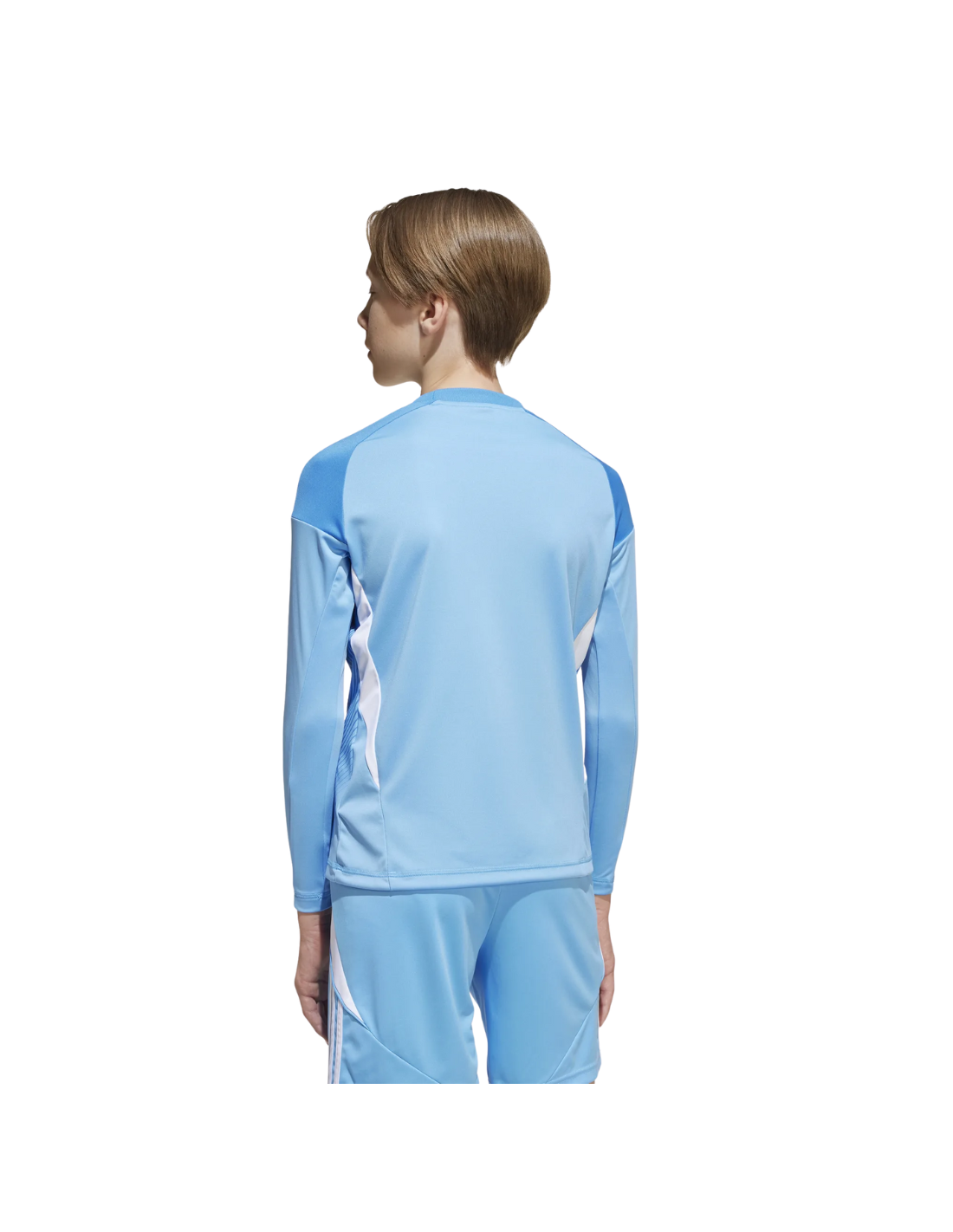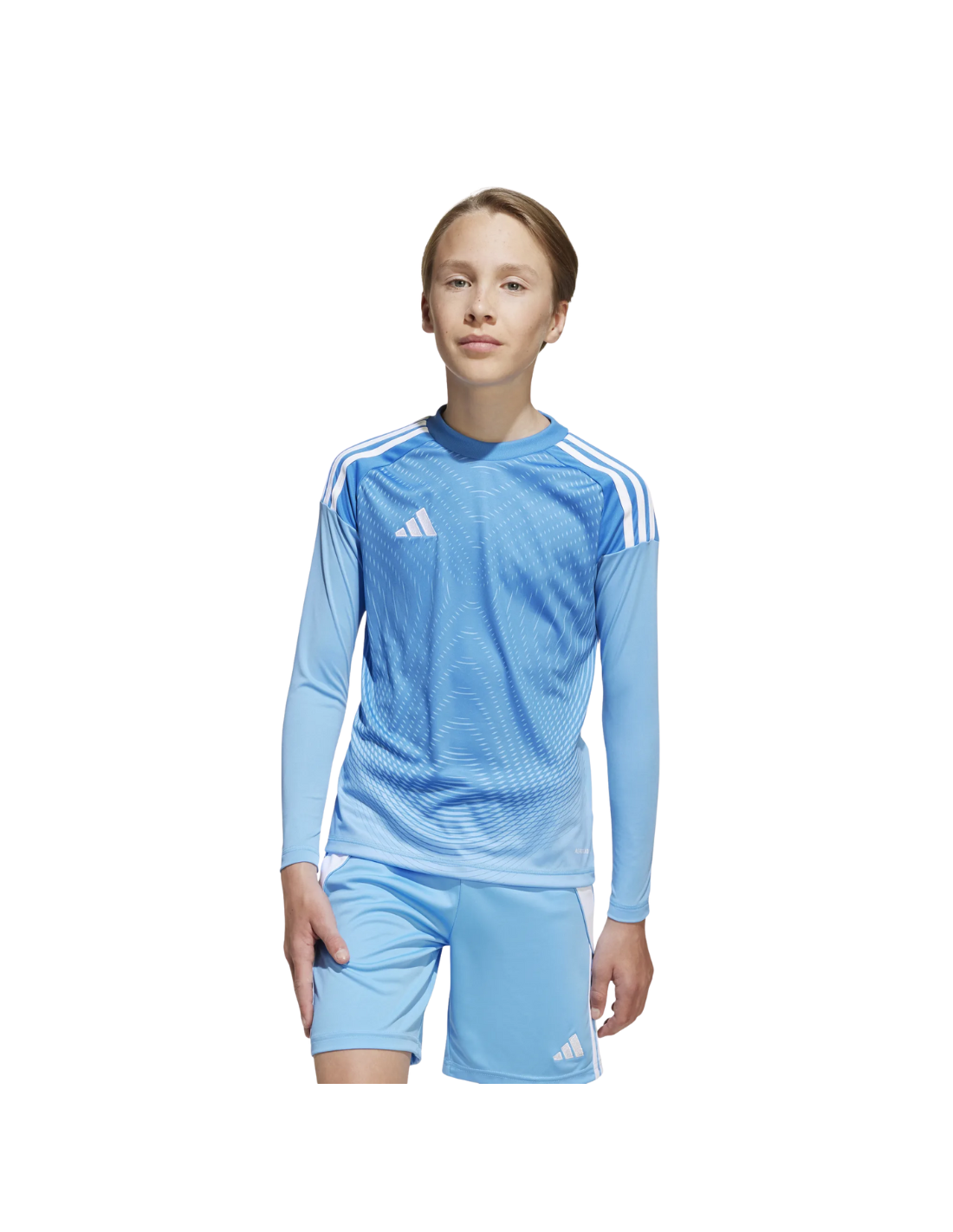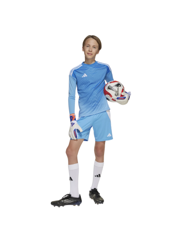 Conjunto portero ADIDAS T25 azul junior (ref. JI9729): equipamiento profesional para jóvenes guardametas. Tejido transpirable AEROREADY, corte ergonómico, refuerzo en codos y diseño moderno para destacar en el campo.