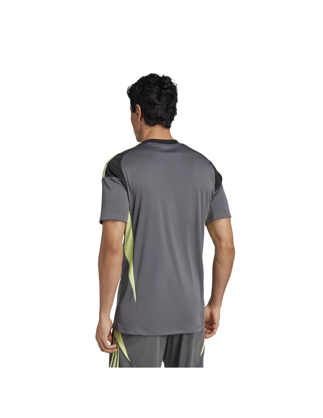 El conjunto presenta un diseño en color negro con detalles en gris y blanco, ofreciendo un estilo sobrio y profesional. La camiseta cuenta con un corte ajustado que favorece la libertad de movimiento, mientras que el pantalón corto y las medias complementan el conjunto con un ajuste cómodo y funcional. El logotipo de ADIDAS está estampado en la camiseta, añadiendo un toque distintivo a la prenda.