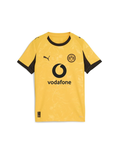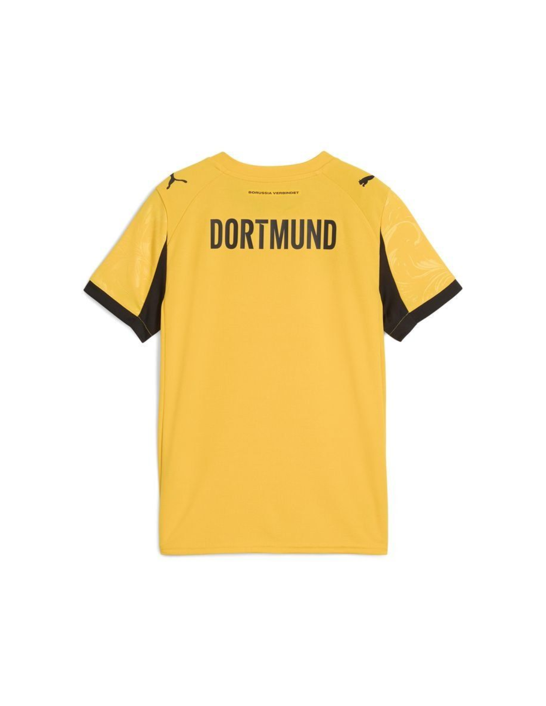 La camiseta presenta un diseño en color Yellow Sizzle-PUMA Black, con un estampado tonal inspirado en la histórica victoria del BVB en 1965/66. El escudo retro del club añade un toque distintivo. Cuenta con un cuello en V y mangas cortas, ofreciendo un ajuste regular que favorece la libertad de movimiento.