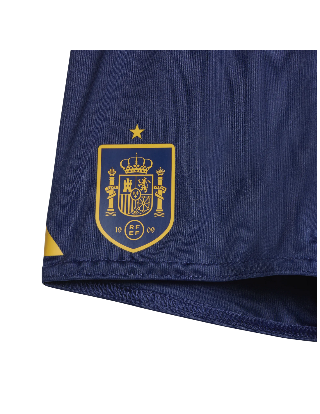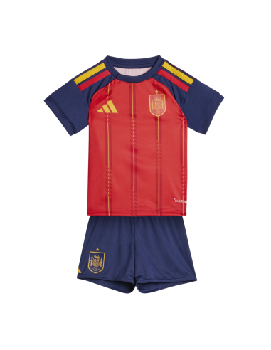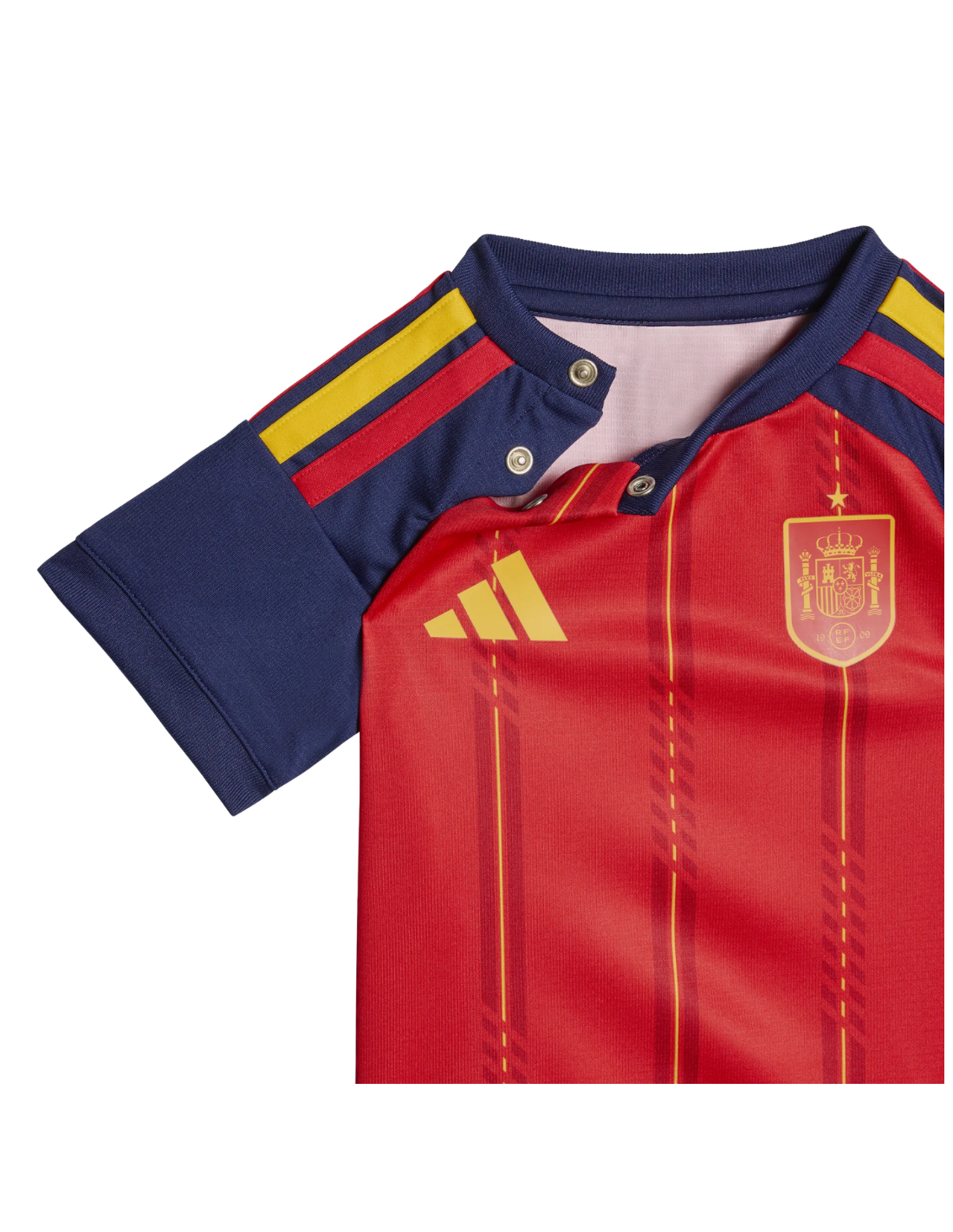 Se trata de un conjunto completo que incluye camiseta y pantalón corto (en tamaños bebé). El diseño sigue la estética de la selección española con tono rojo vibrante (“vivid red”) predominante y detalles en azul marino en el pantalón, además del escudo oficial y el logotipo adidas. El corte es regular (regular fit) pensado para bebés, con cierre de corchetes (snap closure) o facilidad de puesta según talla, para máxima comodidad.