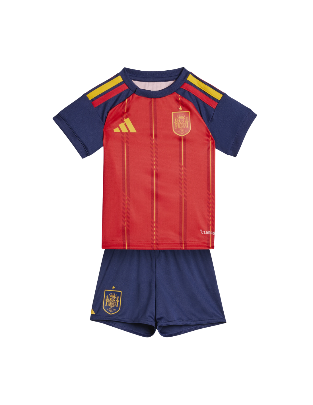 La equipación Adidas España 1ª Baby (ref. JZ5766) está confeccionada en 100 % poliéster reciclado según especificaciones oficiales de adidas para kits de selección. Integra la tecnología CLIMACOOL® que favorece la evacuación del sudor y el secado rápido, manteniendo al bebé fresco y cómodo en sus primeros momentos futbolísticos.