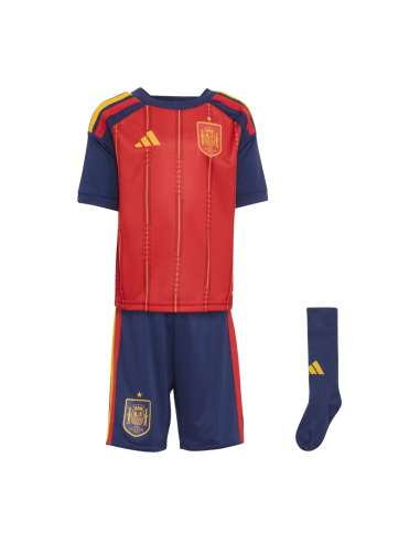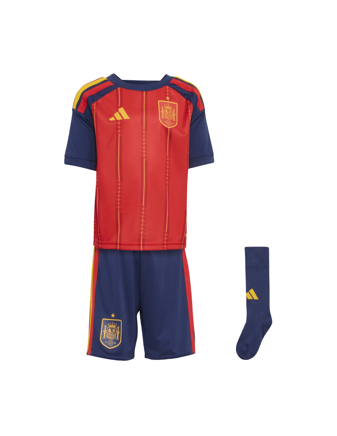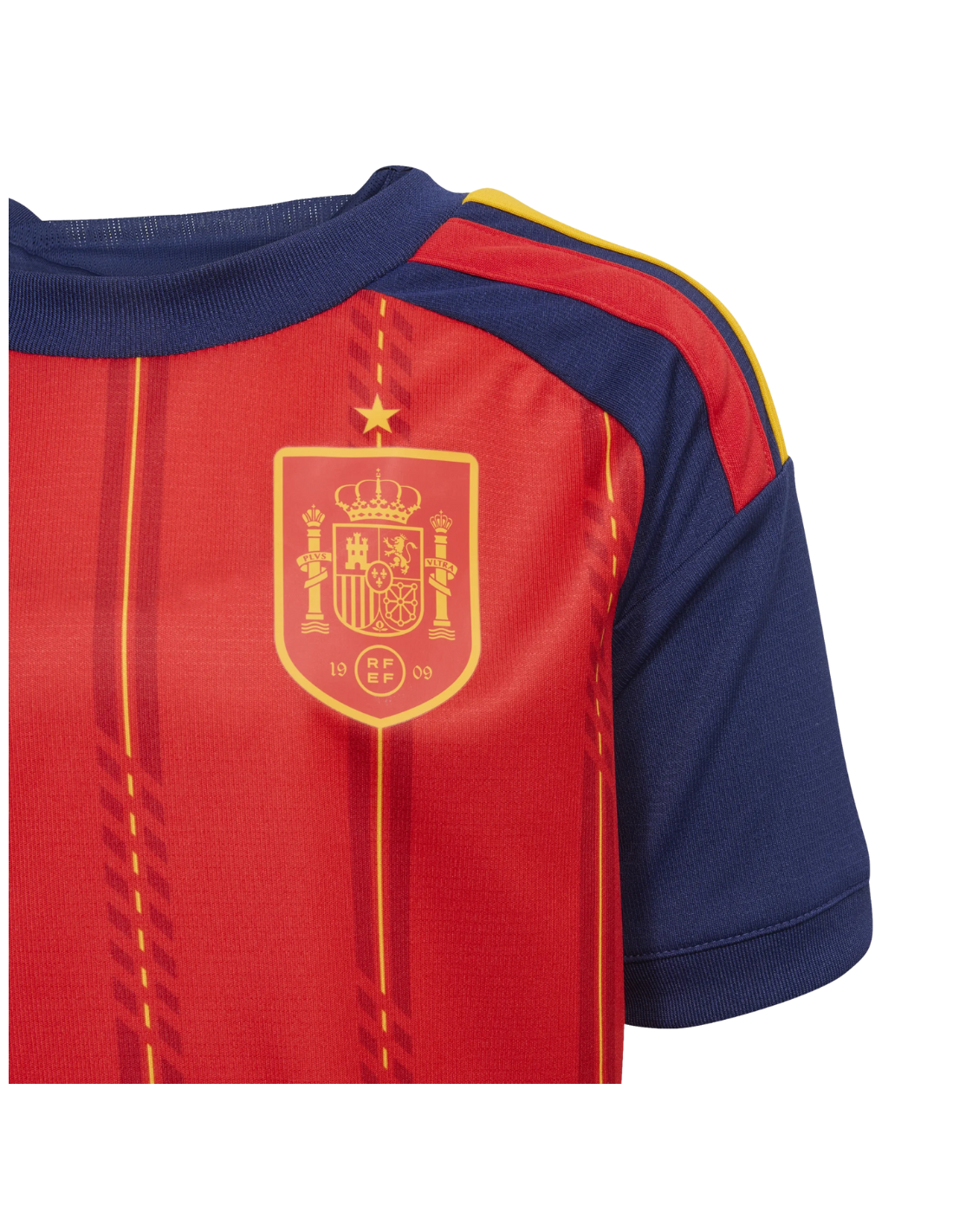 El conjunto presenta los colores tradicionales de “La Roja”: camiseta de tono rojo-intenso con detalles amarillo-dorados, pantalón corto (cuando aplica) y medias (en los kits completos) que reproducen el uniforme oficial. El escudo de la Selección Española está estampado/transfersado en el pecho, y las tres bandas características de Adidas aparecen en los hombros. El corte es clásico, adaptado a edades infantiles.