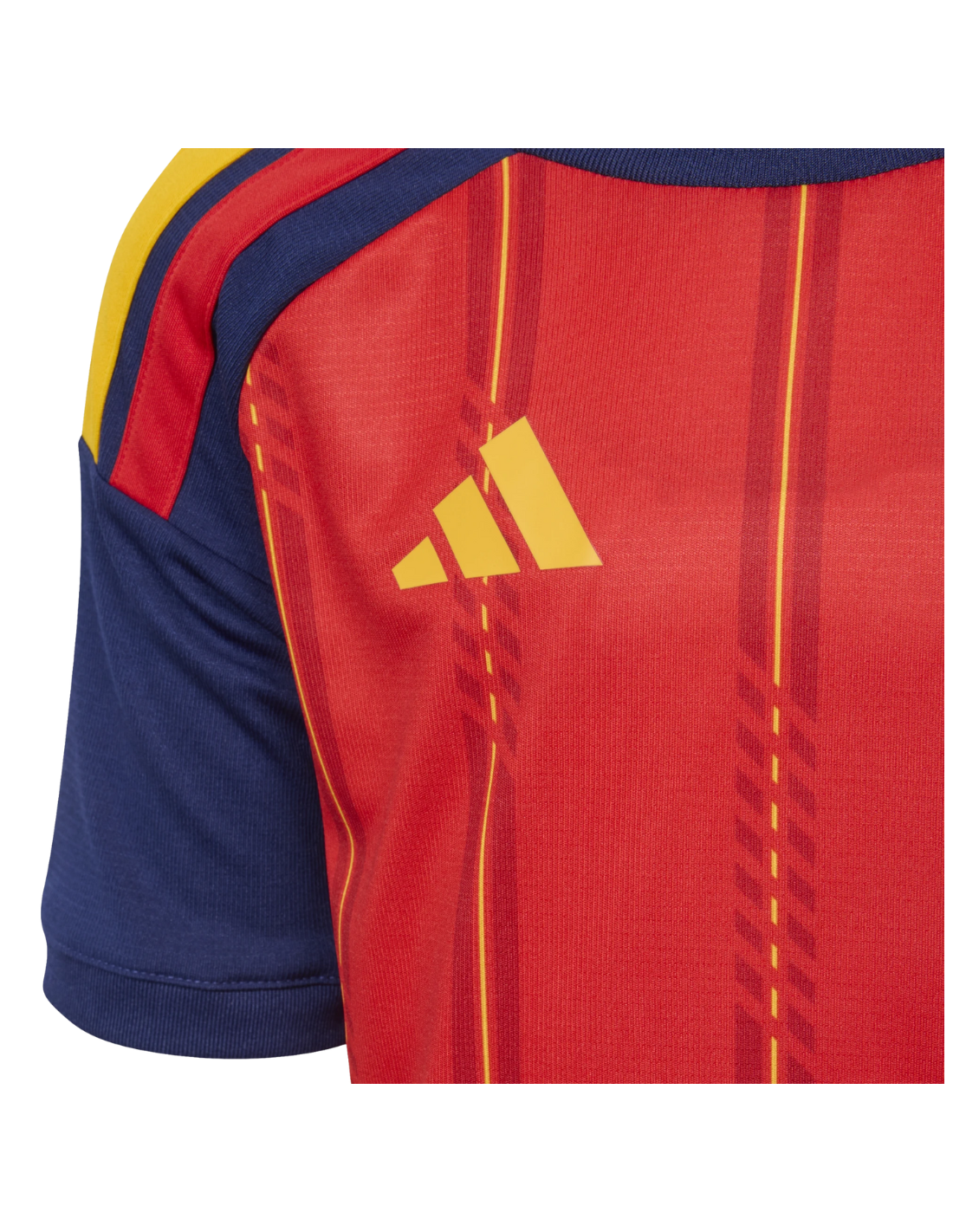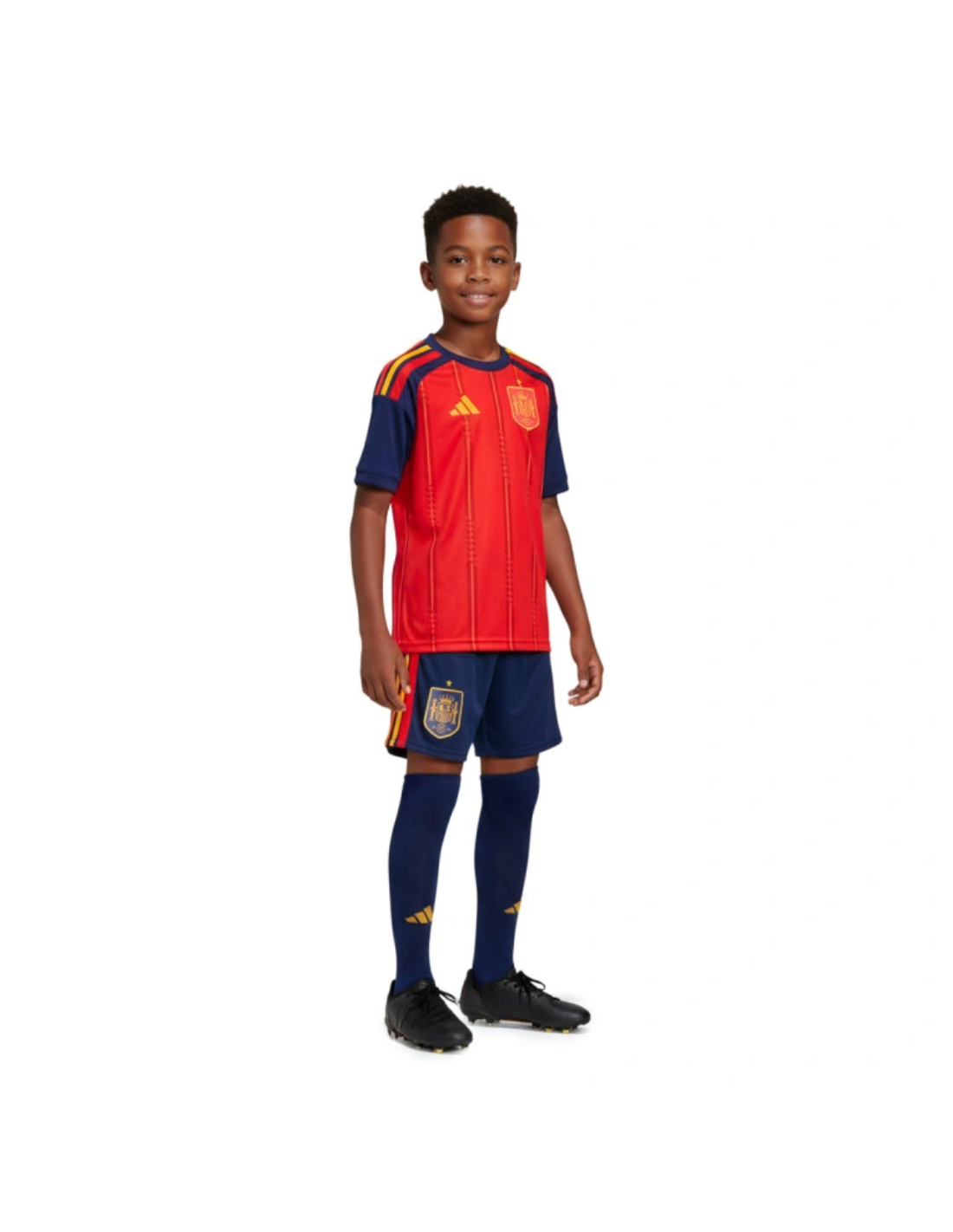 El pack incluye la camiseta (manga corta), el pantalón a juego y los calcetines, todos con el diseño oficial de la Selección Española. La base roja vívida simboliza “La Roja”, complementada con detalles en amarillo y azul marino que rememoran la bandera nacional. La camiseta lleva el escudo de la federación bordado, el logo de Adidas y líneas de diseño moderno. El corte es estándar, pensado para jóvenes, permitiendo comodidad y libertad de movimiento.