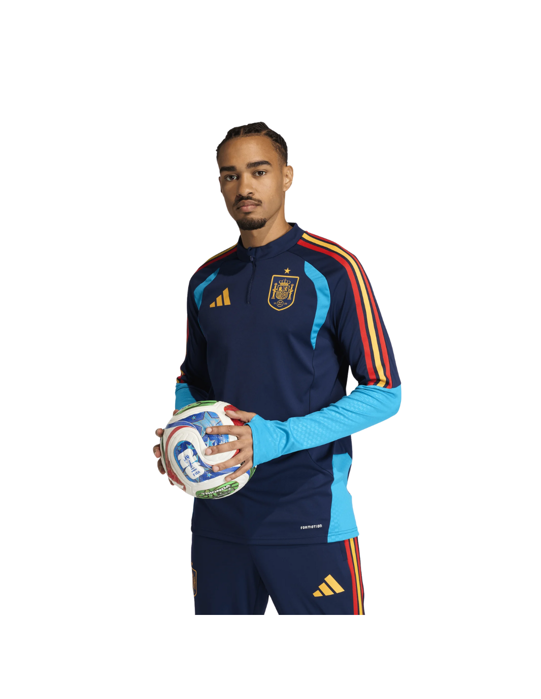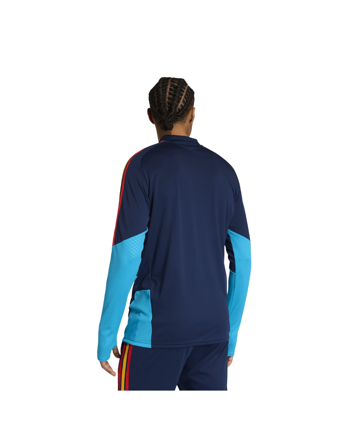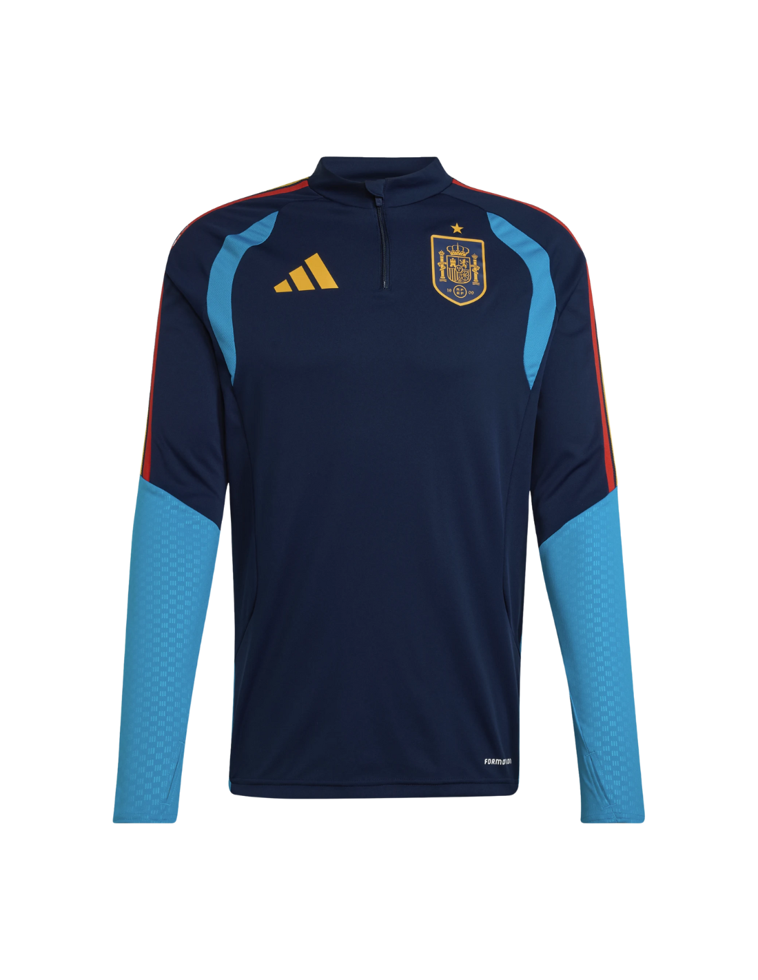 Presenta un elegante color azul marino con detalles en rojo y amarillo, evocando los colores icónicos de España. Cuenta con cremallera corta en el cuello, puños ajustados, ajuste slim-fit y el escudo de la selección española bordado en el pecho, junto al logotipo de Adidas. Su diseño moderno la convierte en una prenda ideal tanto para entrenar como para lucir un look deportivo urbano.