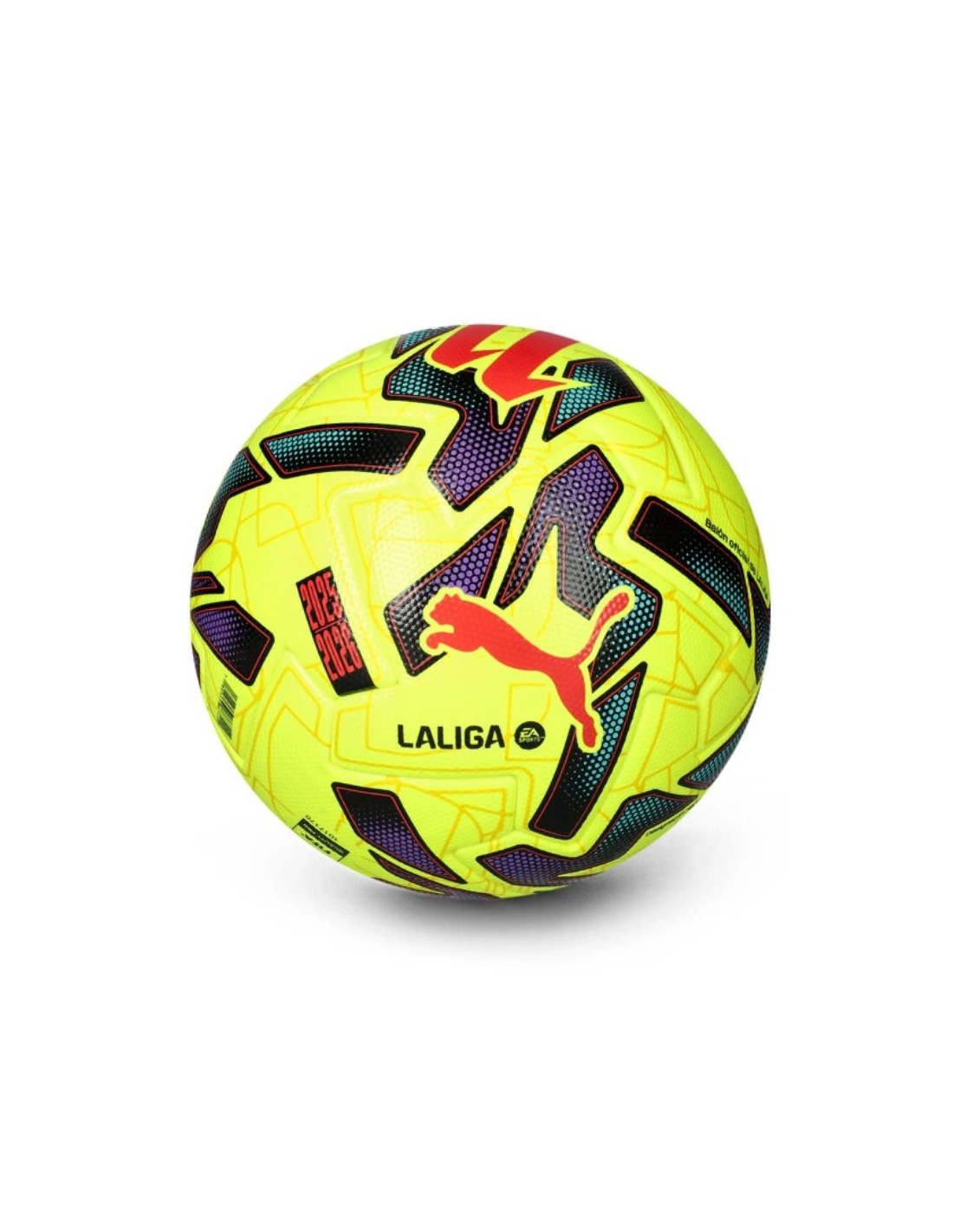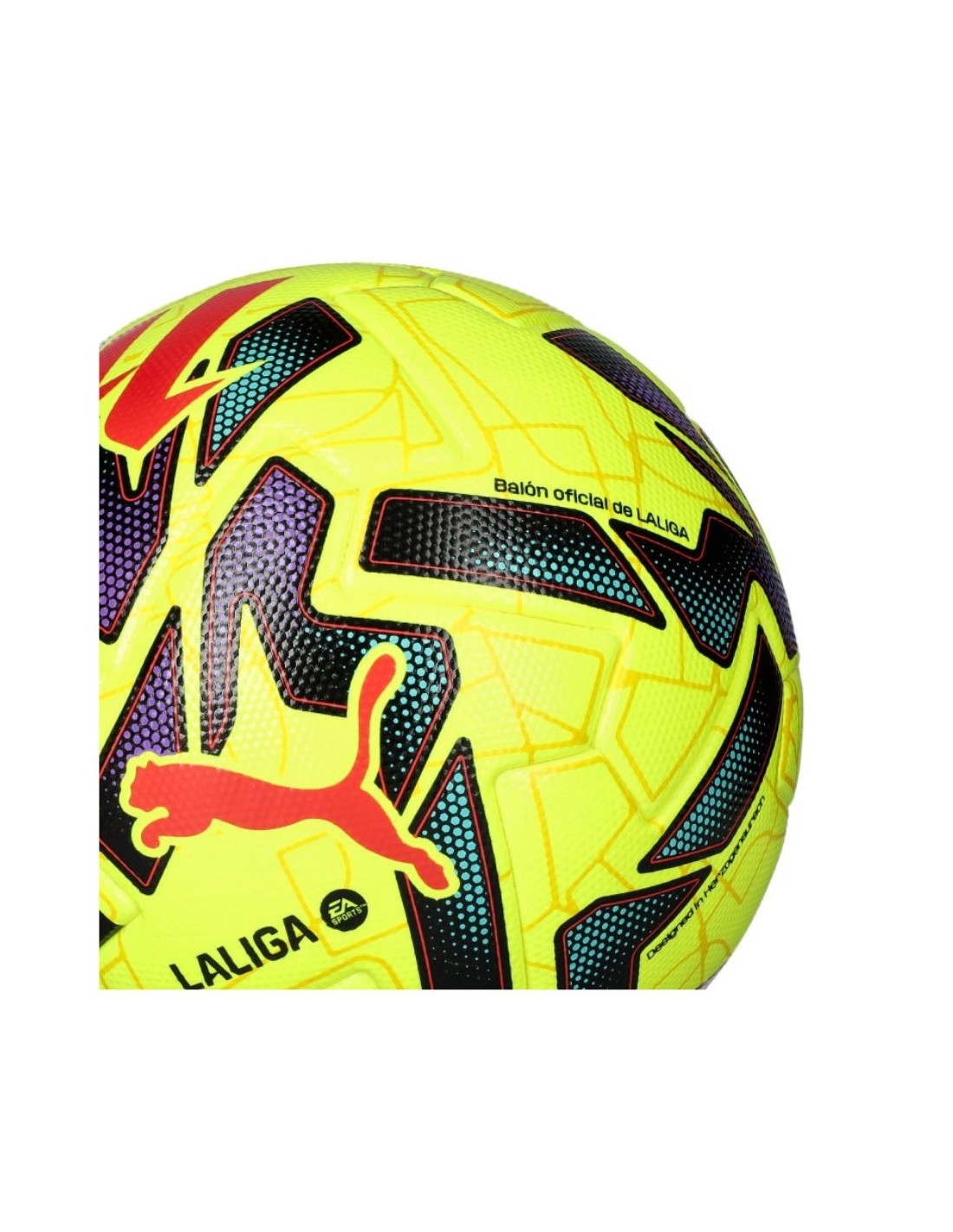 Color amarillo de alta visibilidad con gráficos oficiales de LaLiga y sello Puma. Cumple medidas y peso reglamentarios para partidos oficiales y está disponible en tamaño 5.