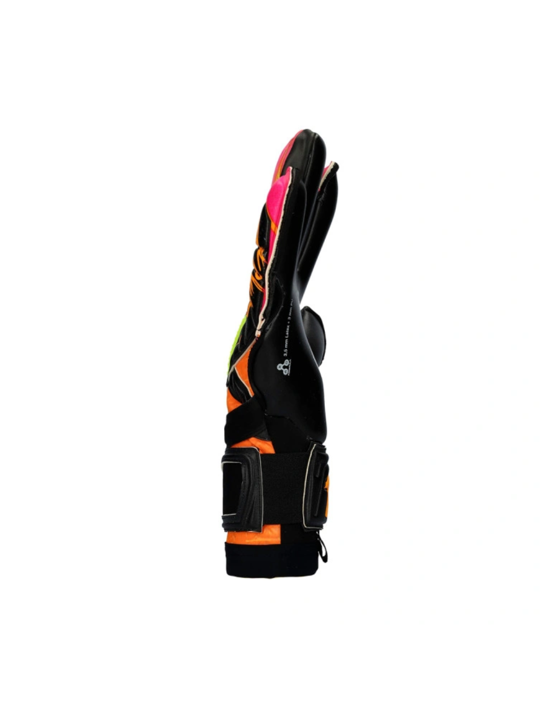 El Rinat Egotiko X Pro está fabricado con materiales de alta gama que garantizan rendimiento profesional. La palma incorpora látex alemán AXG Formula, reconocido por su excelente adherencia, gran amortiguación y buena resistencia incluso en condiciones exigentes. En el dorso, presenta refuerzos de látex natural en el dedo índice y meñique, así como una aplicación textil con impresión por sublimación digital y gel impreso en los dedos medio y anular, montados sobre neopreno para un ajuste ligero pero robusto. El cierre cuenta con una cinta de muñeca textil superelástica y una solapa de látex grabado de alta frecuencia, con doble punto de ajuste y lengüeta personalizada.