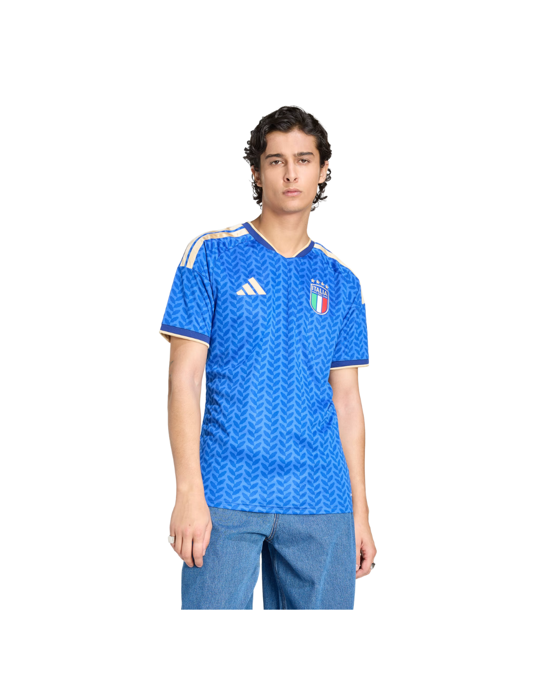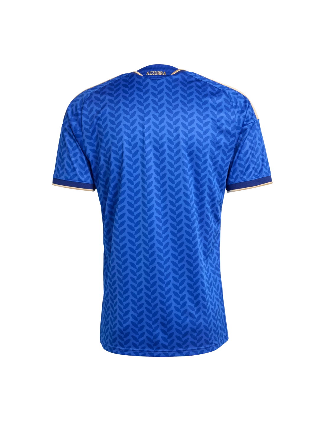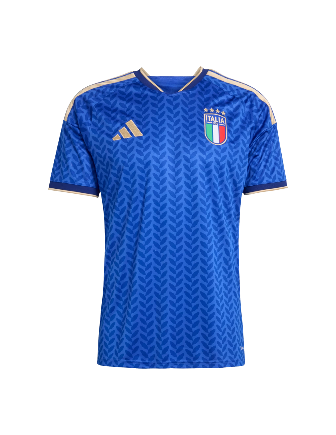 Esta primera equipación presenta el clásico color azul de Italia con detalles en blanco y el escudo de la Federación Italiana bordado en el pecho.