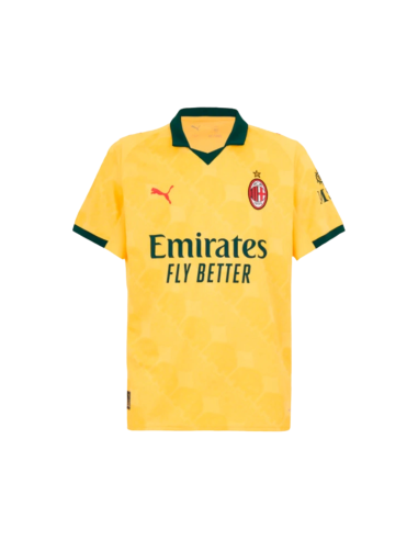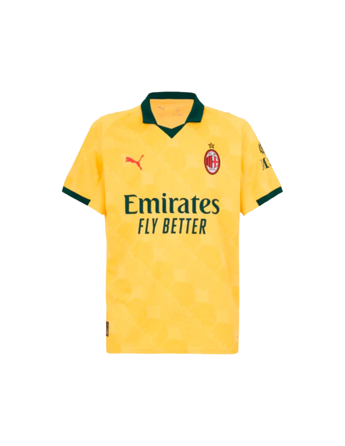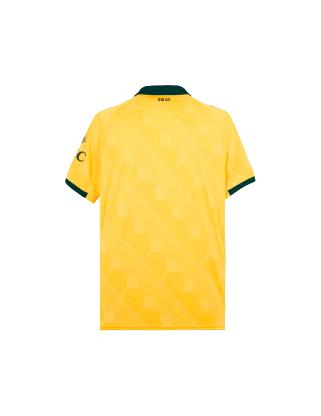 El diseño presenta una base de color Sunny Yellow con ribetes y cuello tipo polo en Dark Myrtle (verde oscuro). El estampado de monograma ACM en todo el tejido reinventa el clásico diseño de la temporada 95/96, conferiendo un look elegante y retro. Los logos de PUMA (gato) y de AC Milan en pecho y patrocinador “Emirates Fly Better” al centro completan un acabado auténtico de club.