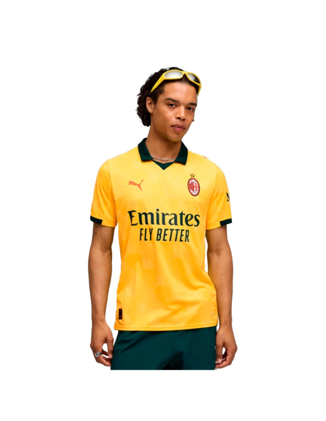 Camiseta PUMA AC Milan 3ª Equipación 2025/26 (ref. 779979 03) en amarillo intenso con detalles en verde oscuro, diseño inspirado en la temporada 95-96 con monograma ACM renovado. Tecnología dryCELL para máximo confort y versión Replica sostenible con tejido reciclado RE:FIBRE. Disponible en tallas S a 3XL.