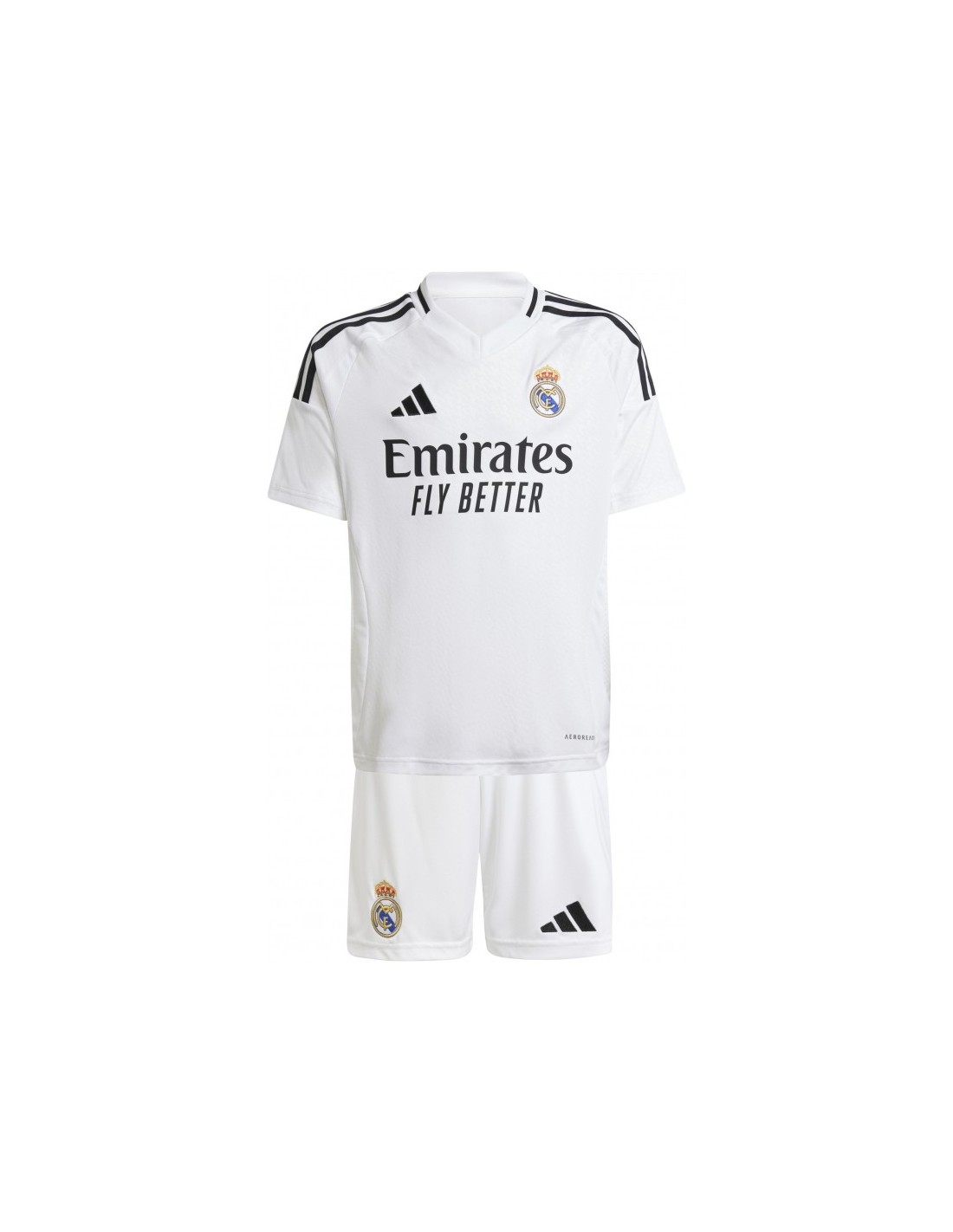 Este conjunto incluye la icónica camiseta blanca del Real Madrid con detalles en dorado, pantalones cortos blancos y calcetines a juego. La camiseta presenta el escudo del Real Madrid y el logotipo de ADIDAS en el pecho, así como las tres rayas distintivas de la marca en los hombros. Los pantalones cortos tienen un ajuste cómodo y los calcetines proporcionan un soporte óptimo.