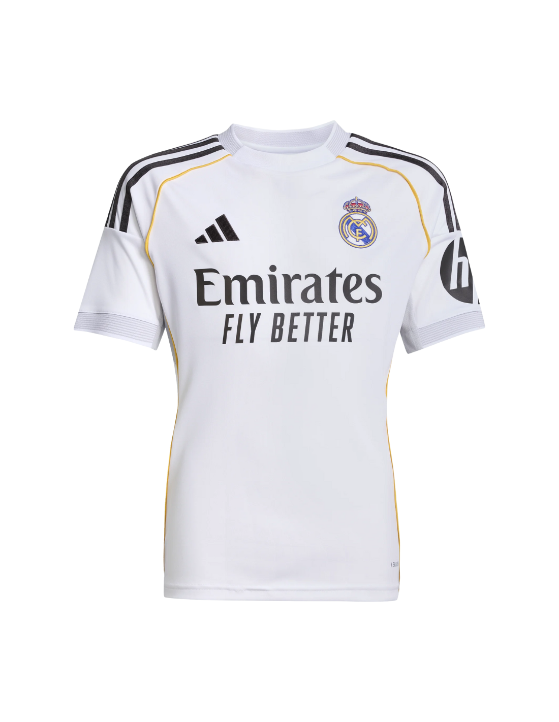 ADIDAS, líder global en innovación deportiva, une fuerzas con el Real Madrid para ofrecer una camiseta que honra la historia del club con una visión moderna. Cada detalle dorado representa el prestigio, la clase y la ambición constante del equipo blanco.