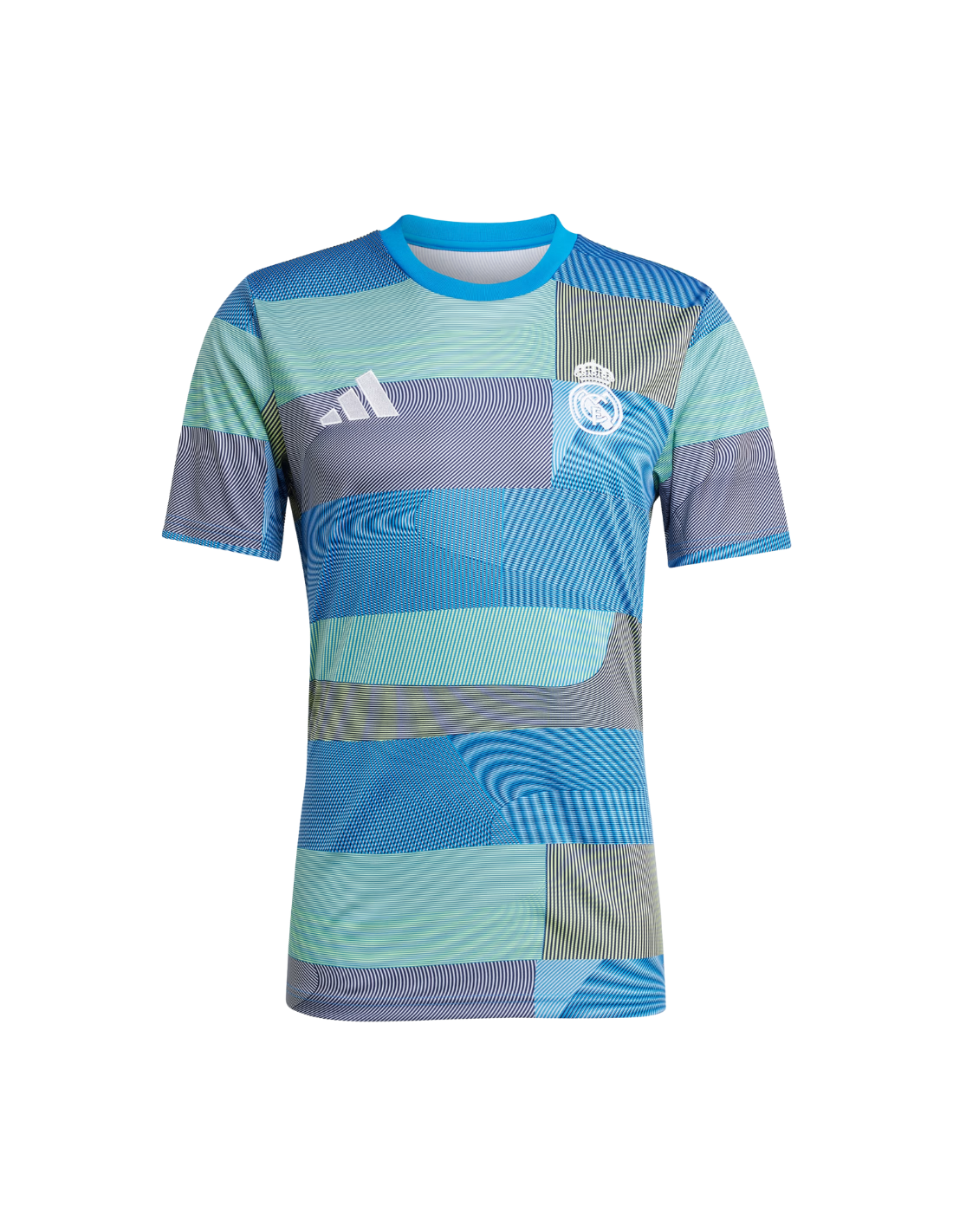 Se trata de una camiseta de manga corta y corte regular (regular fit), con cuello redondo tipo crewneck para máxima comodidad. Presenta un diseño gráfico integral en tonalidad Blue Bird, inspirado en las líneas arquitectónicas del nuevo estadio Santiago Bernabéu, aportando un estilo moderno y representativo del club. El escudo del Real Madrid está bordado sobre el pecho, detalle distintivo de autenticidad.
