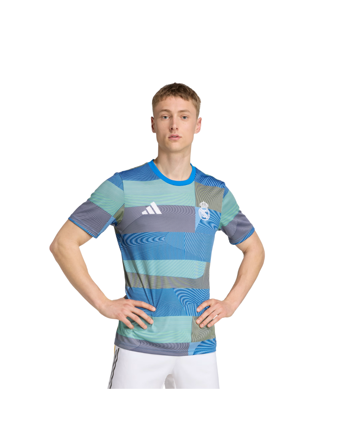 La camiseta Pre-Match Real Madrid 25/26 (código JP4155) está confeccionada con 100 % poliéster reciclado, promoviendo la sostenibilidad sin sacrificar su rendimiento. Incorpora la tecnología AEROREADY de adidas, que absorbe la humedad y mantiene la piel seca durante entrenamientos o calentamientos.