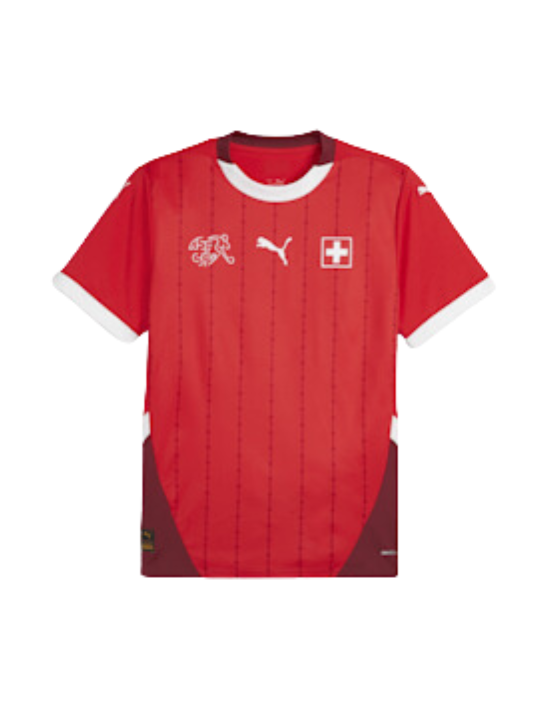 Esta camiseta presenta el diseño icónico de la primera equipación del equipo nacional suizo. Con los colores rojo y blanco, y el escudo de la Federación Suiza de Fútbol en el pecho, te destacarás con estilo auténtico en cada partido. Su ajuste regular proporciona una sensación cómoda y favorecedora para cualquier tipo de cuerpo.