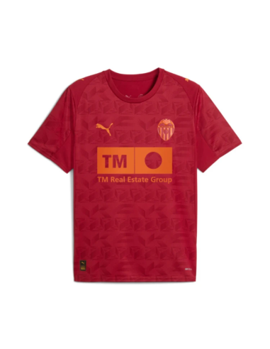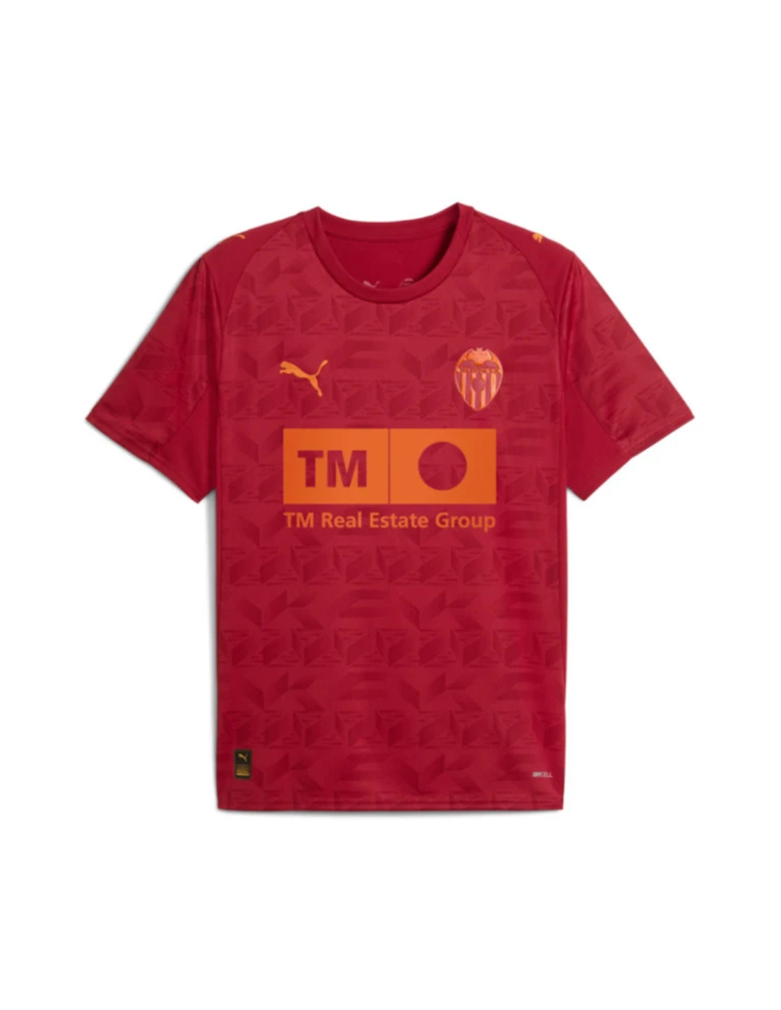 Camiseta PUMA segunda equipación Valencia CF 2025-26 (ref. 948281 05) en rojo “Torino”. Tecnologías ULTRAWEAVE y dryCELL: ultraligera, transpirable y flexible. Diseño monocolor con las letras “VCF” en relieve frontales, patrocinadores TM y Divina en naranja Mediterranean Orange. Disponible en versión réplica y profesional. ¡Ideal para auténticos valencianistas!